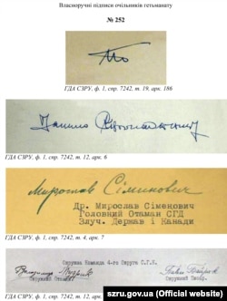На документах керівних діячів гетьманців-державників того періоду – підписи Олександра Шаповала, Михайла Солтиса, Миколи Гуля, Григорія Матвіїва та інших, скріплені здебільшого печатками Союзу гетьманських організацій Америки і Канади.