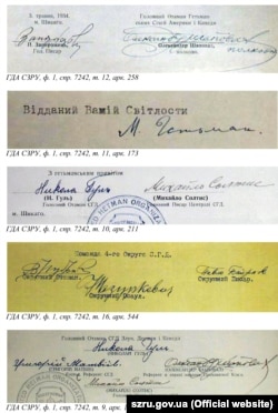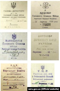 На цих бланках є такі написи: «Канцелярія Головного Отамана Військ Української Народної Республіки. Ставка» (липень 1920 р.), «У.Н.Р. Ад’ютант Головного Отамана Військ Української Народної Республіки. Ставка» (березень 1920 р.), «У.Н.Р. Штаб Повстанського отряду імені Ів. Мазепи» (191_ р.), «У.Н.Р. Командір 5-го Київського кінного полку. Д. Армія» (жовтень 1920 р.), «Директор Державного банку України» (березень 1919 р.), «У.Н.Р. Українська дипл. Місія в Речіпосполитій Польській. Військовий референт. Варшава» (березень 1920 р.) та інші.