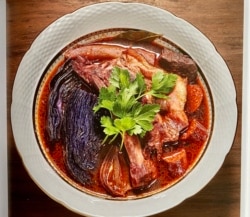 - Цибулю, селеру, петрушку, моркву, червону капусту, свинячу ногу, волову шию, волову вирізку, копчений свинячий живіт, ковбасу (на смак), приправу до бульйону, сіль, перець, духмяний перець, ялівець, лавровий лист.
