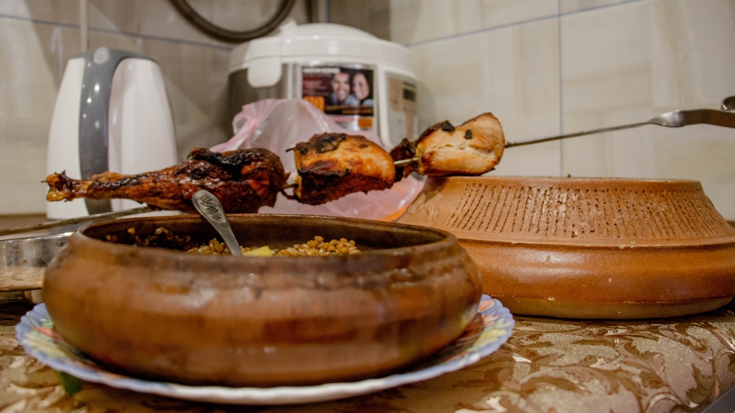Господар дому дістає із горщика полбу (національна страва), а в окрему тарілку складає смажене м’ясо. На столі вже чекає вірменський лаваш і кінза. Це основні страви вірменської кухні.