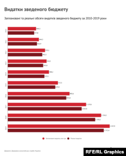 Верховна Рада ухвалила бюджет на 2021 рік. Експерти вже звертали увагу на тривожний розрив між видатками та доходами у проєкті бюджету, поданого урядом для першого читання. Радіо Свобода оглянуло звіти про виконання бюджетів за останні 10 років, щоб виявити, наскільки бюджетні плани урядовців та парламентарів збігалися із реальністю раніше.
