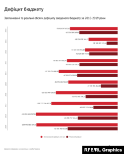 За останні 10 років, згідно з аналізом зведеного бюджету, кошторис жодного разу не був профіцитним – видатки завжди перевищували доходи. При цьому реальний дефіцит зазвичай нижчий за запланований. Але й закладений у бюджеті негативний розрив між доходами й видатками за цей період не перевищував 135 мільярдів гривень.