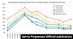 Вікове розмежування українського електорального поля набуло першорядного значення з 2019 року. Дані національного екзит-полу показали, що понад половина виборців Зеленського у першому турі була молодшою за 40 років, в той час як більшості виборців Бойка, Тимошенко і навіть Порошенка було за 50. Після обрання президентом «рейтинг» Зеленського стабільно продовжував корелювати із віком респондентів.