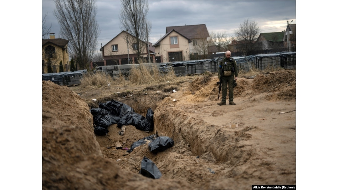 На знімку від 6 квітня український військовий стоїть біля братської могили з тілами мирних жителів, загиблих під час російської окупації Бучі